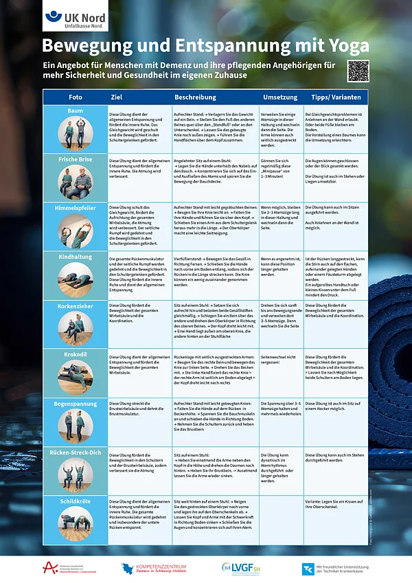 Die Unfallkasse Nord bietet auf ihrer Homepage das Poster „Bewegung und Entspannung mit Yoga“ zum kostenlosen Download an. Es zeigt neun Übungen, die Menschen mit Demenz zusammen mit ihren pflegenden Angehörigen durchführen können.